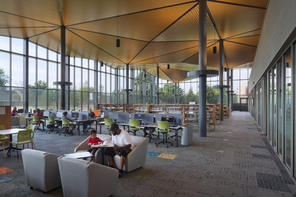 The branch namesake Anna Mott, daughter of Toledo abolitionists, inspired geometries found in Underground Railroad quilts. The park setting deserved a design that enhanced and respected the landscape and an adjacent grove of trees. These two influences combined to create the library’s bold triangulated roofscape and structure. The library revitalizes the Mott namesake, while also reinforcing the landscaped setting to function as a pavilion in the park.