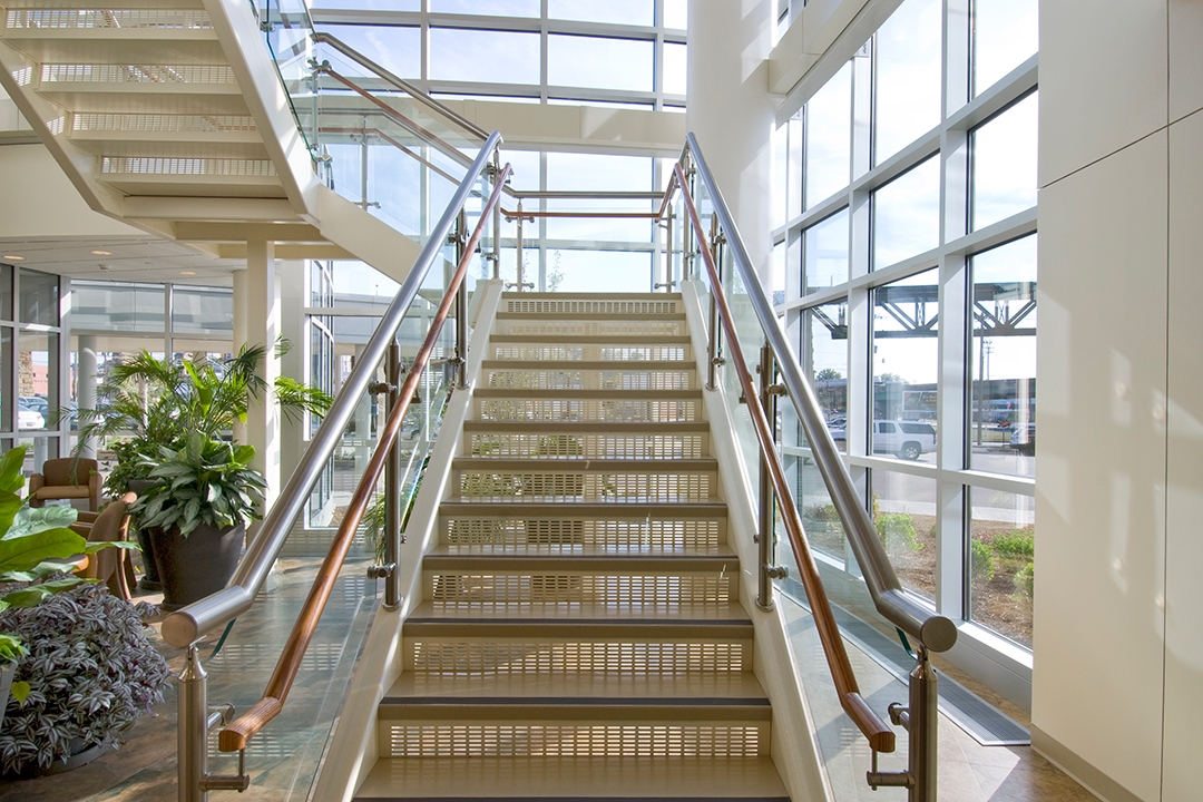 An initial Master Plan studied the Hospital’s functional processes and program relationships in order to propose planning options meeting the Hospital’s goal of order and coherence in the expanded facility. The option selected created an addition with a much needed second public entrance to the south of the existing facility that significantly improved access to the hospital with a welcoming light-filled spaciousness to greet arrivals. The plan inserted a new circulation armature that maintained clarity of way-finding for visitors, patients, and staff members. The new circulation also created coherent organization in the arrangement of new and relocated programs. Clear flow and organization for surgical care and outpatient traffic increased staff efficiency and enhanced patient care. “Right-sizing” patient rooms and stations provided a more effective healthcare environment.