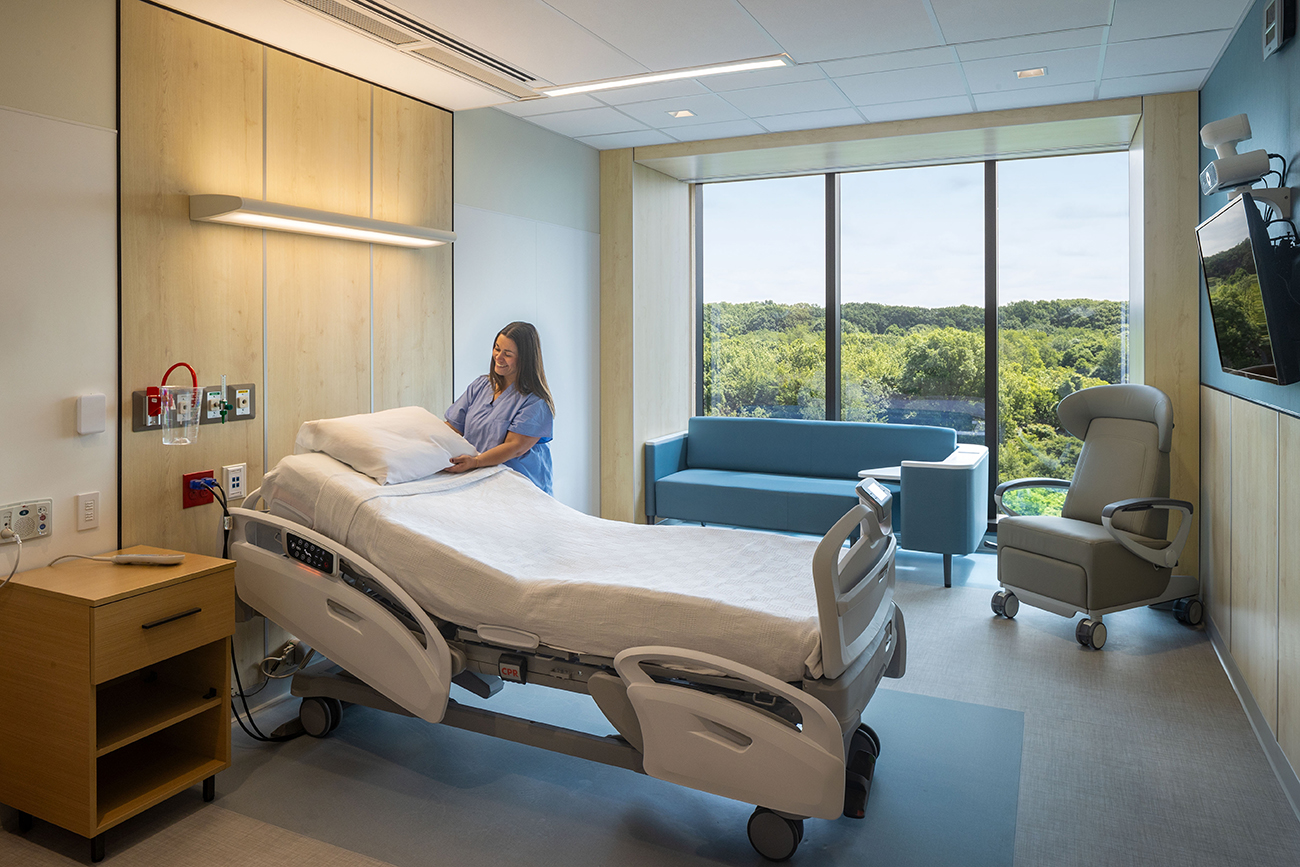 Important aspects of the final design include a new front door and entry experience for the community, improved parking, and a refreshed consistent design language to reflect the care provided by the dedicated staff. The design focused on ‘respite’, creating a calming space for patients and families during their stay. ARMC is also an affiliate to the Cleveland Clinic and clinically, the spaces were designed to reflect the size, quality, and arrangement to provide an optimal care environment.
