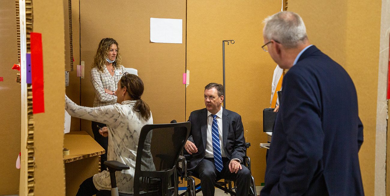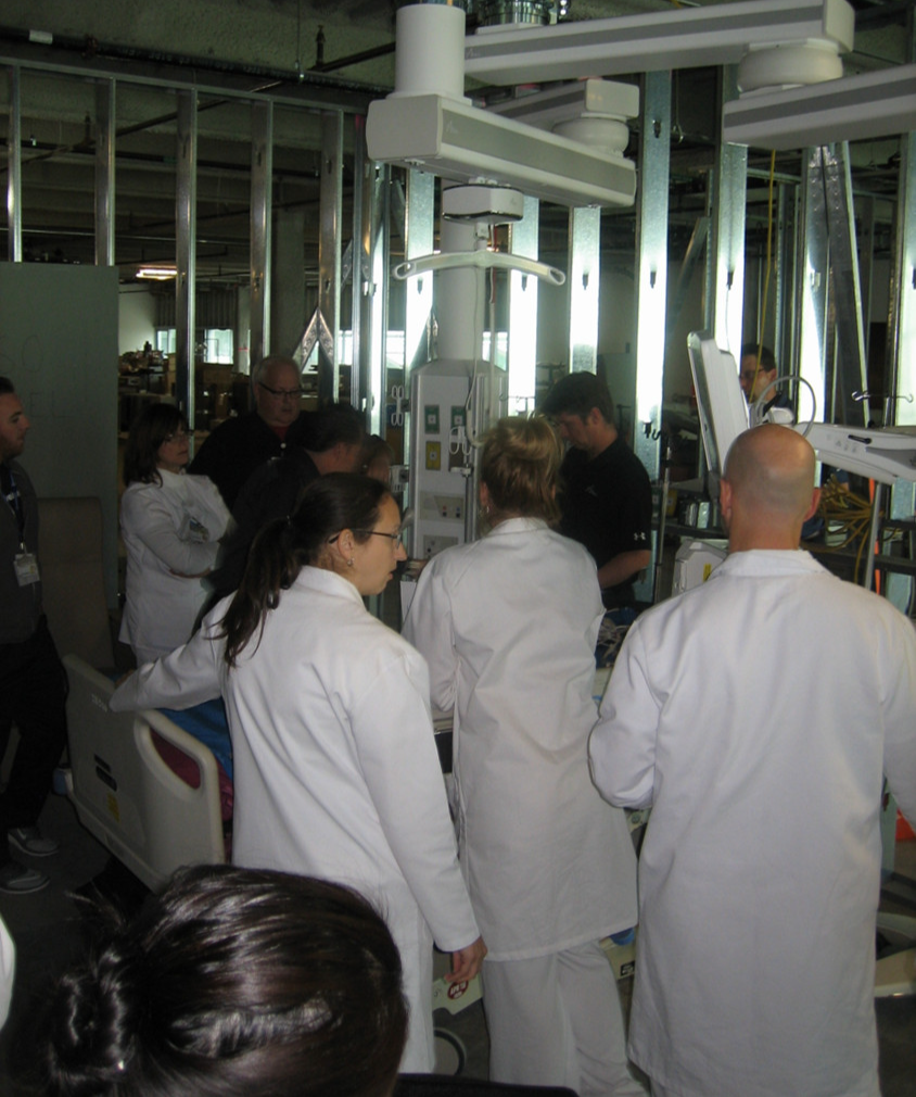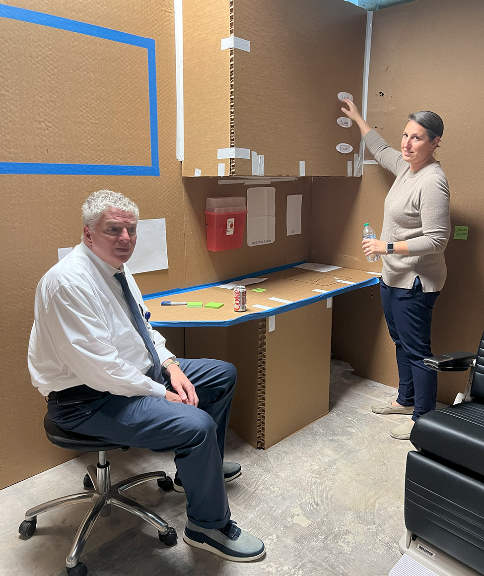 An effective engagement process uses a full toolkit of methods. Each method is selected to match the complexity of decisions that users need to make. Digital engagement is a common starting point because it is fast and familiar, yet its speed comes with limits. Many clinicians are not trained to read drawings or interpret architectural graphics. When decisions depend solely on a screen–shared floor plan or a static rendering, misunderstandings are almost guaranteed. To remove that guesswork, design teams increasingly turn to tools that create progressive levels of realism. Cardboard mock-ups allow teams to grasp scale and orientation in minutes, revealing issues that two dimensional drawings cannot. Virtual reality and panoramic renderings offer a deeper level of immersion, enabling care teams to walk through future spaces and experience flow, sightlines, and adjacencies before anything is built. Physical mock-ups take this even further. Though they come with a cost, they often save exponentially more on the backend. Built rooms allow clinicians to test the exact placement of outlets, equipment booms, headwalls, storage, and workflow choreography, while simultaneously giving project teams practical insight into how the space will be constructed. No digital tool can replace the clarity that comes from watching a physician reach for an outlet or maneuver a boom in a full-scale prototype. This is the difference between imagining a workflow and experiencing one.